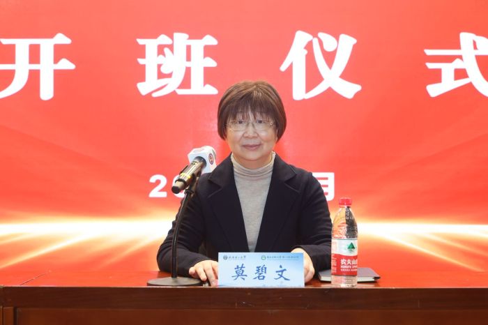 莫碧文院长在致辞中,对我校为研修班筹备所付出的努力表示衷心感谢。她指出,数字化是推动医院治理体系和治理能力现代化的关键抓手,武汉理工大学在数字赋能管理方面的实践经验具有极强的借鉴意义。此次组织近200名中层干部集中参训,希望借助我校优质教育资源,帮助医院管理骨干更新数字化理念、掌握 AI 实用工具、提升数字化管理效能,以数字化转型助力医院高质量发展。